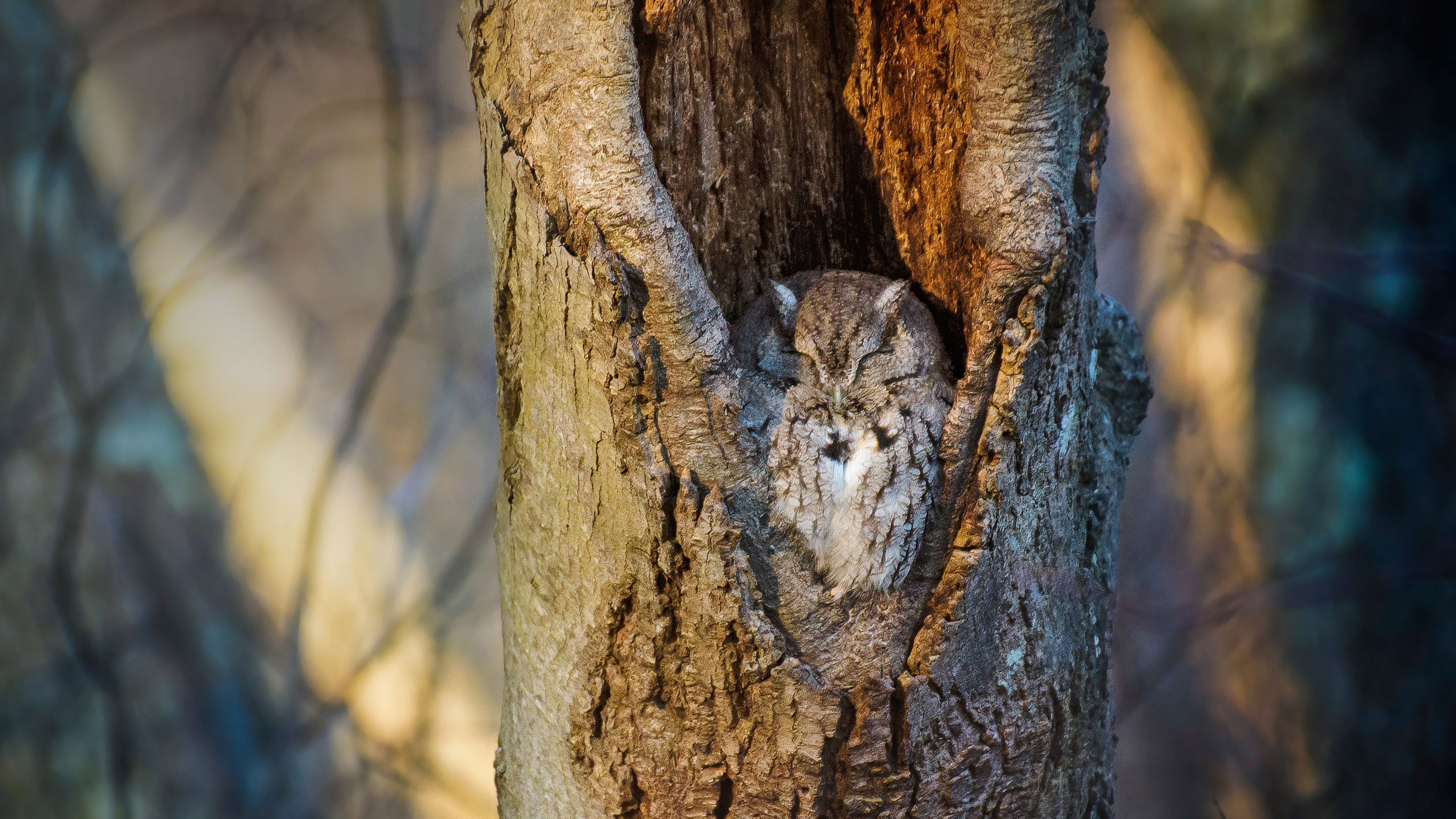 Screech owl resting in a tree cavity, Massapequa Preserve, Long Island, 纽约州 (© 维基·乔伦, Babylon and Beyond Photography/盖蒂图片社)
