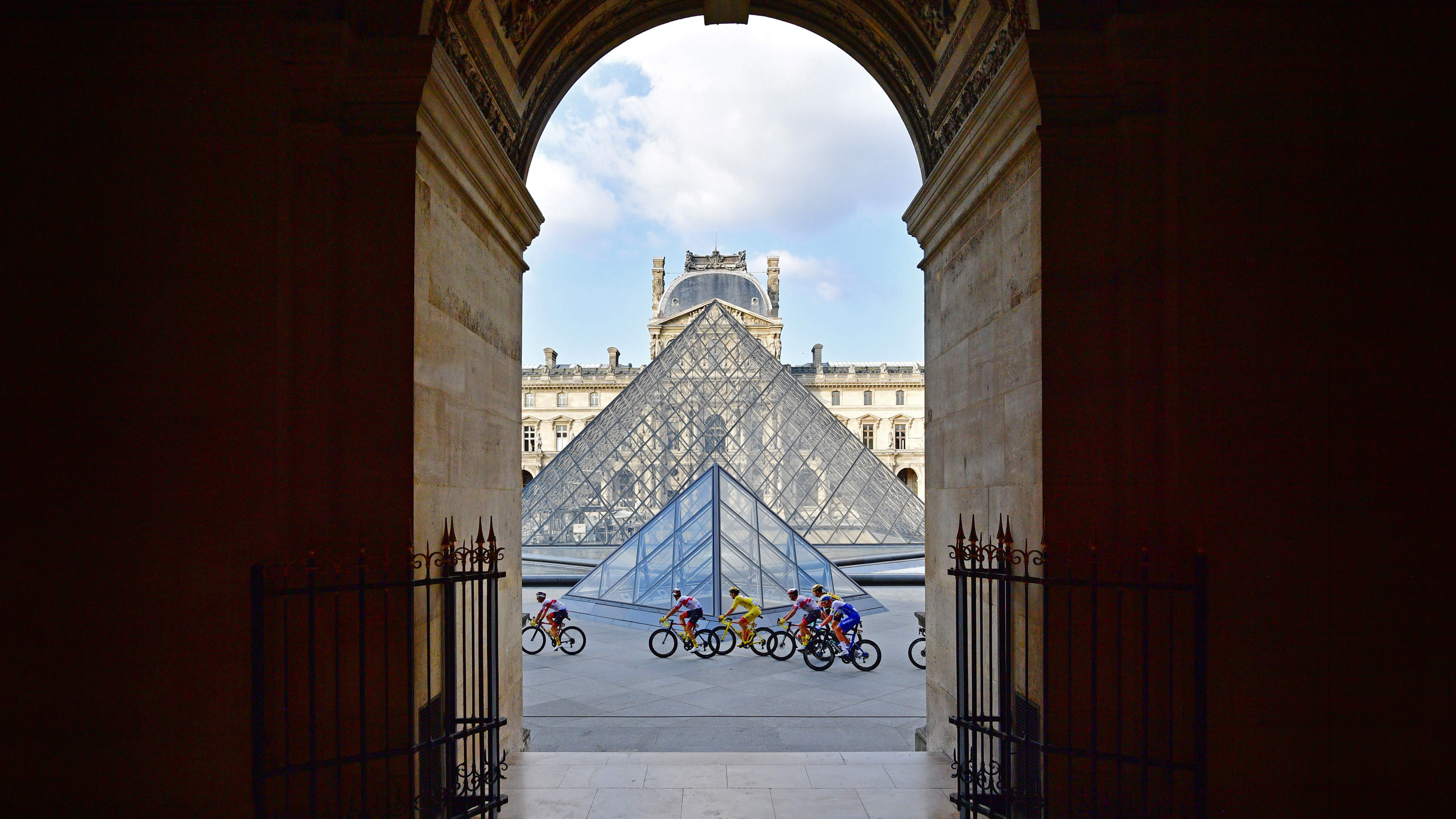 Tour de France riders in front of the Louvre Pyramid and Museum in Paris