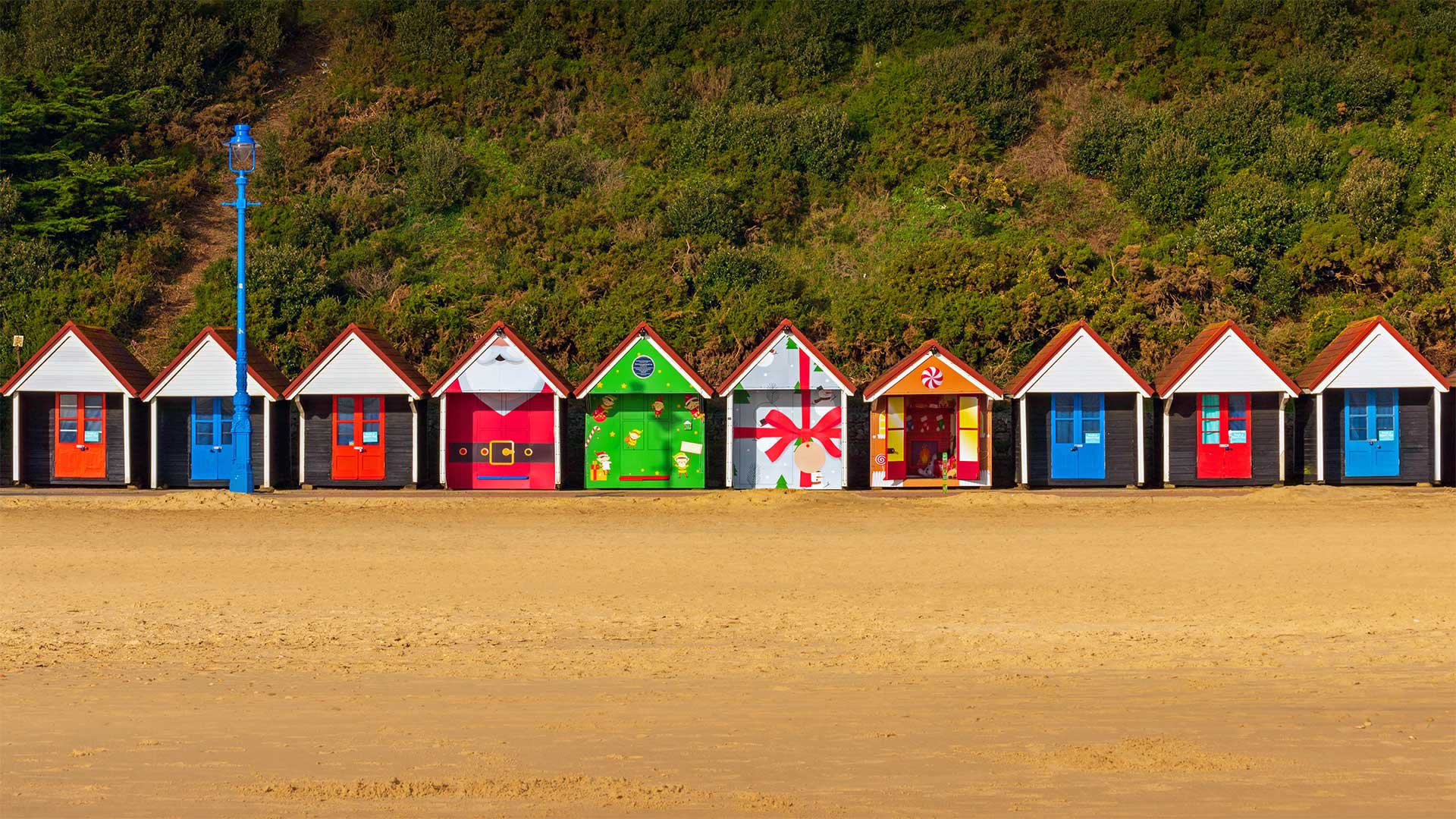 Christmas-themed beach huts in Bournemouth, 英格兰 (© Allouphoto/Alamy)