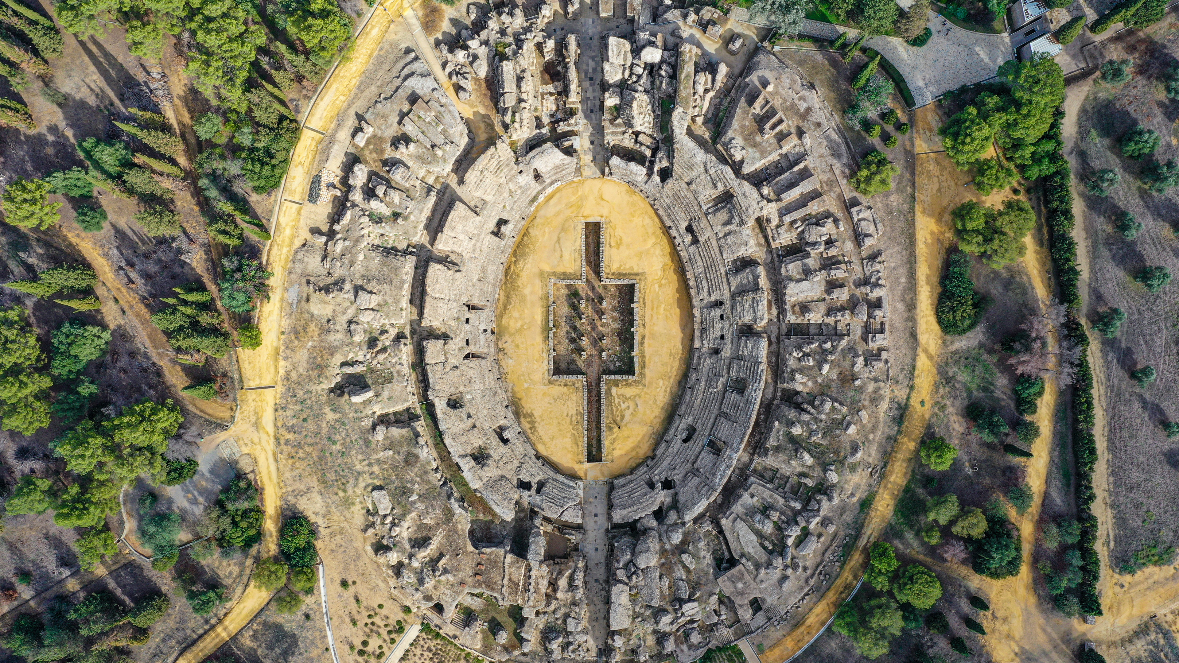 The Roman amphitheater of Italica, near Seville, 西班牙 (© Moses Palermo/Amazing Aerial Agency)